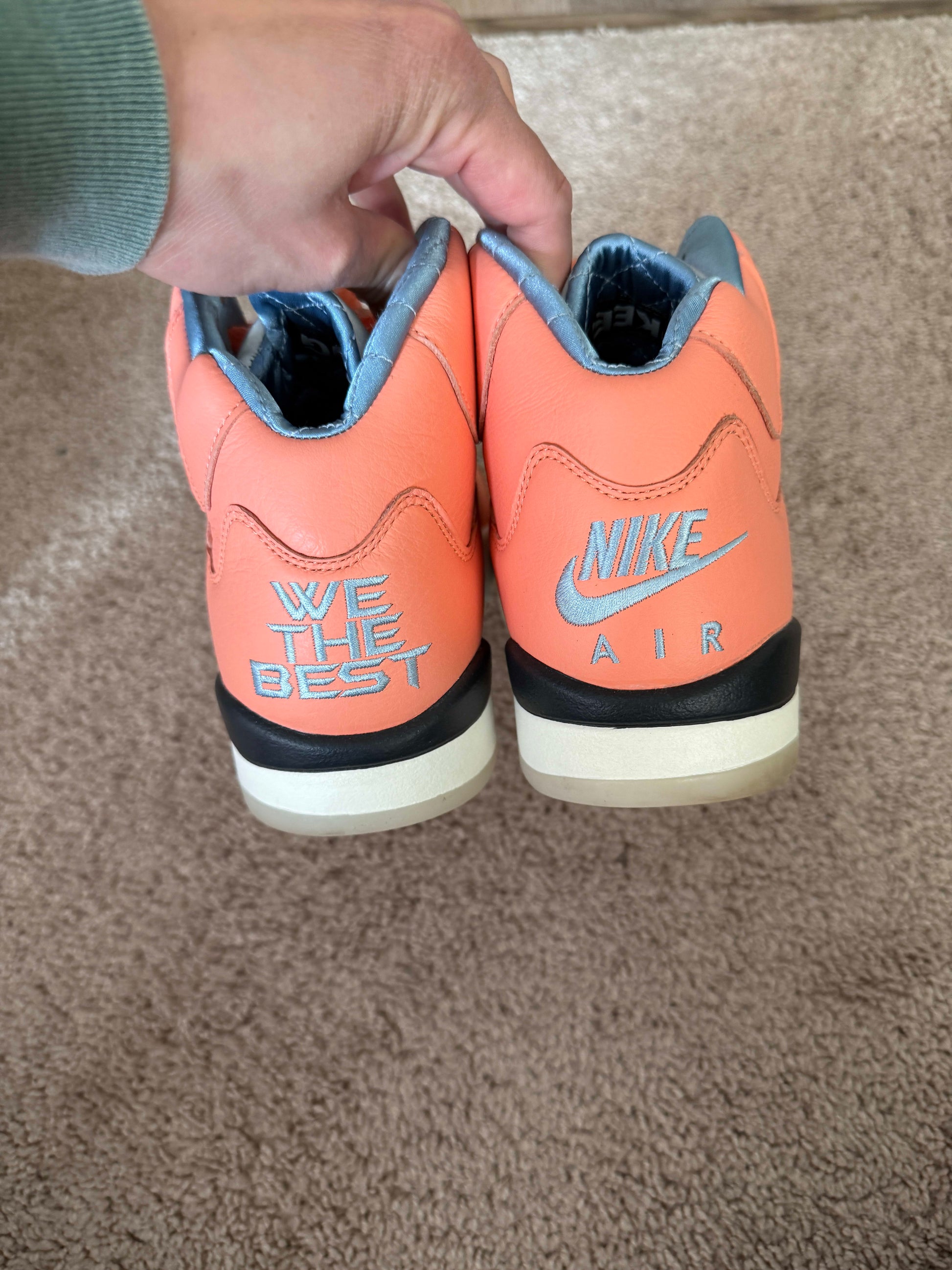 The Air Jordan 5 Retro DJ Khaled We The Best Crimson Bliss is a collaboration between footwear brand and the American musician.<br><br>This Retro Air Jordan 5 comes in crimson bliss , leche blue-sail colorway. The upper is coral leather with a Leche Blue quilted lining. Each heel overlay has the Nike Air logo on the right and 'We the Best' on the left. Reflective silver tongues feature Jumpman branding. Off-white polyurethane midsole with blue shark-tooth detailing and Air-sole unit in heel. Mismatched Jumpman and 'We the Best' branding appear on the outsoles.<br><br>The Air Jordan 5 Retro DJ Khaled We The Best Crimson Bliss was released on the 28th of November 2022, retailing for $225.